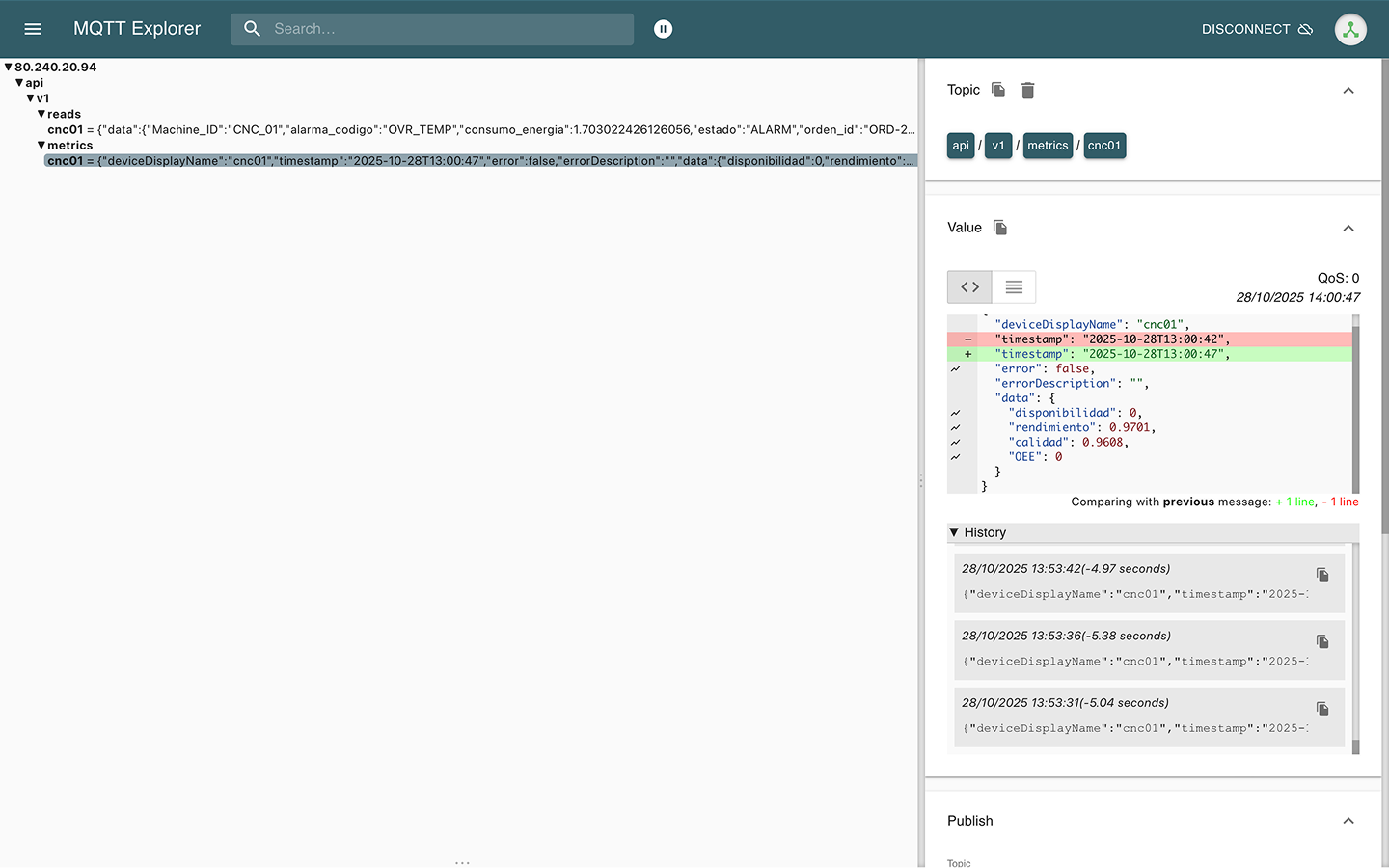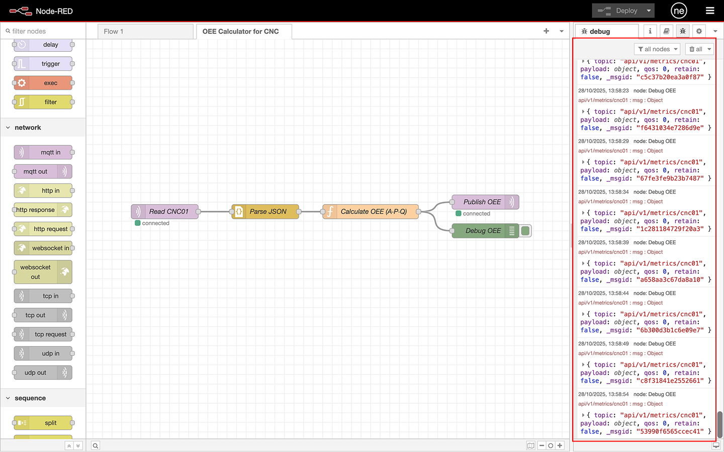 After deployment, both MQTT nodes should turn green, indicating a successful connection. Now, open the Debug panel to inspect the messages being published with the computed OEE metrics.