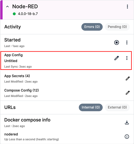 You can modify them in the Compose Config and App Secrets sections of the Node-RED workload card, respectively.