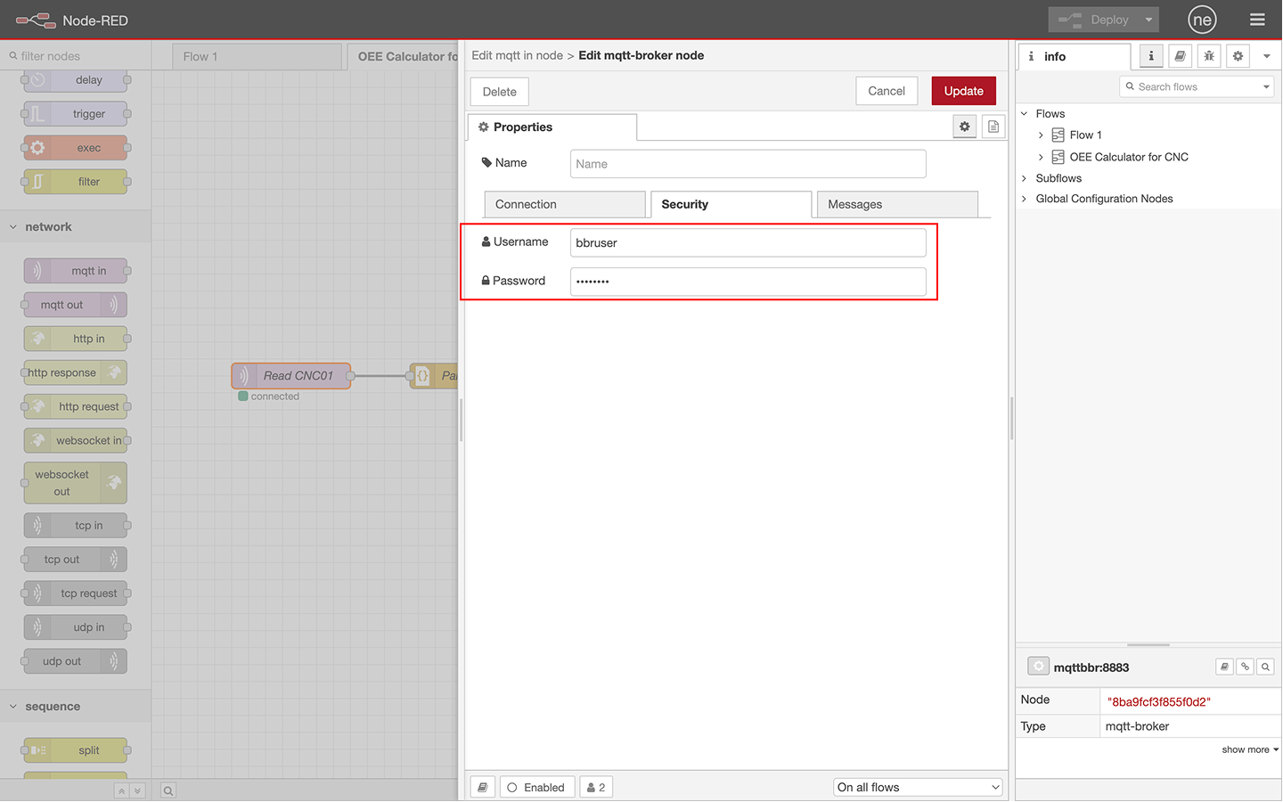 Once authenticated, you'll see the OEE flow you just configured. Initially, the MQTT IN and MQTT OUT nodes may show a "not connected" status because the connection parameters still need to be configured.